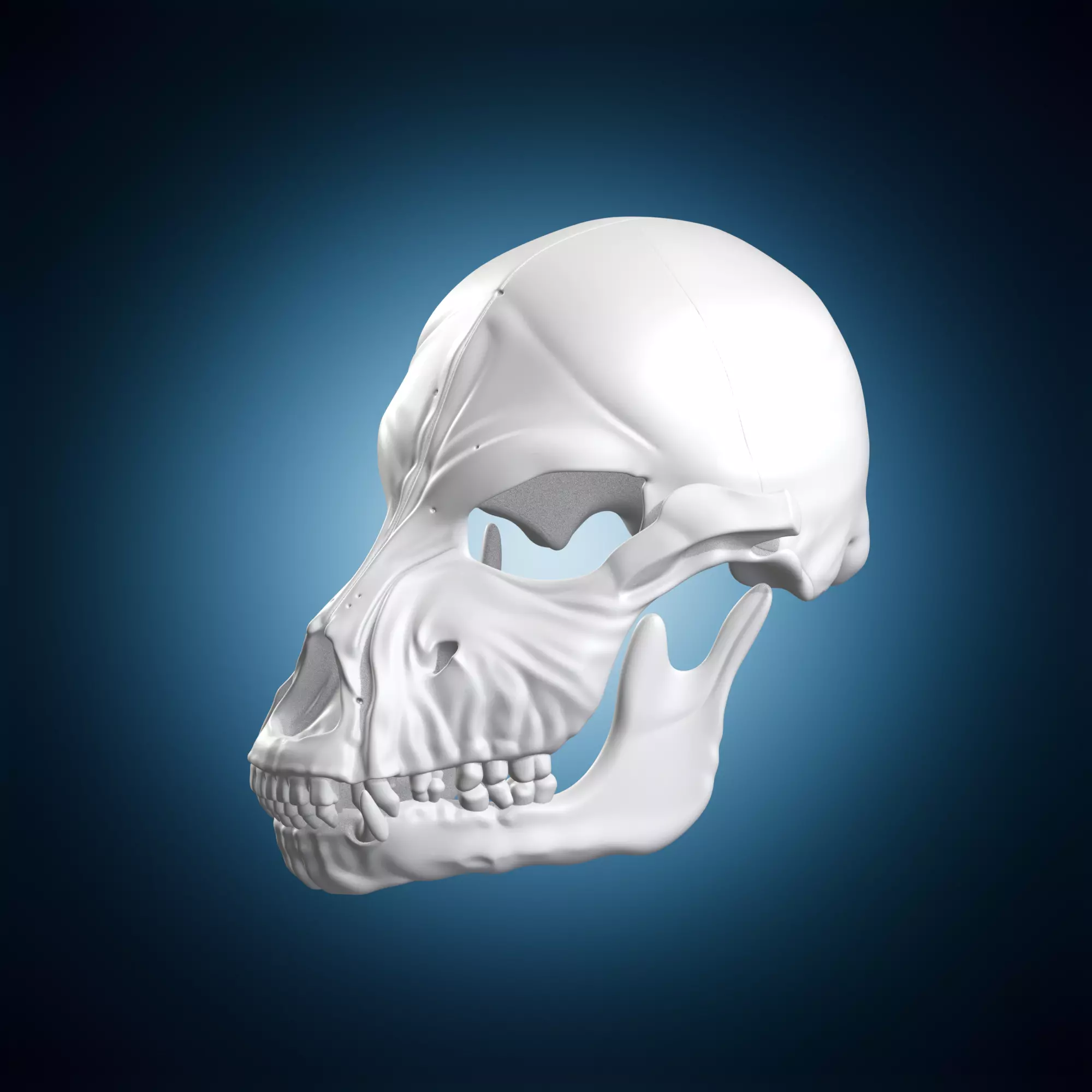 A detailed 3D model of a primate monkey skull for anatomical study purposes, designed as a sculpture for artistic and educational use. The model is highly accurate and suitable for medical professionals, students, and artists. It can be used to study the skull structure, understand human evolution, or simply as a creative inspiration for art projects. The 3D model is available in various formats and can be easily imported into popular modeling software. This sculpture is made from high-quality materials and features intricate details that showcase the complexity of the primate monkey skull.