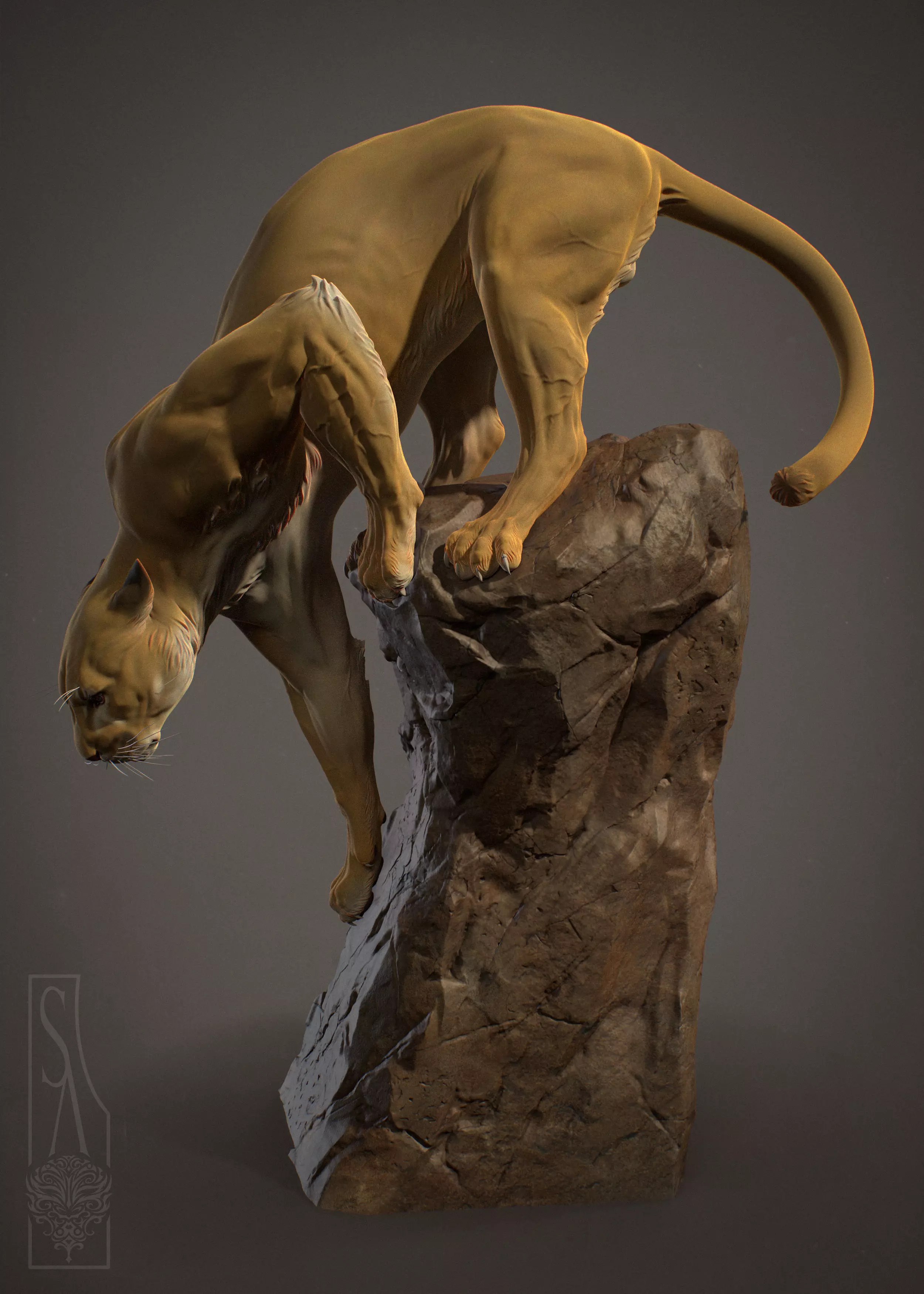 Mountain lion, puma, panther, wildcat, catamount, painter, cougar, and many more names for the same feline. Mountain lions live in a wide variety of areas, historically ranging from coast to coast and from Northern Canada to South America.Big cat anatomy study, piece sculpted in Zbrush.Inspired by the “Reaching Jaguar” carved by Anna Hyatt Huntington sometime between 1926-1932.great as an ornament for your desk and a complex pose to help artists with anatomy. It's 25cm in height assembled, but it can easily be scaled to other sizes. If you have any issues feel free to contact me.