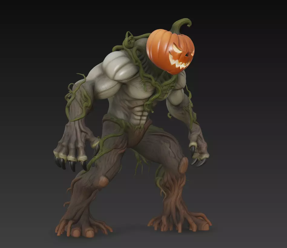 This Pumpkin-Head Forest Monster 3D Model blends dark fantasy with Halloween-inspired design.Built with a muscular humanoid anatomy and rooted, tree-like limbs, the creature embodies a powerful fusion of nature, curse, and seasonal horror.