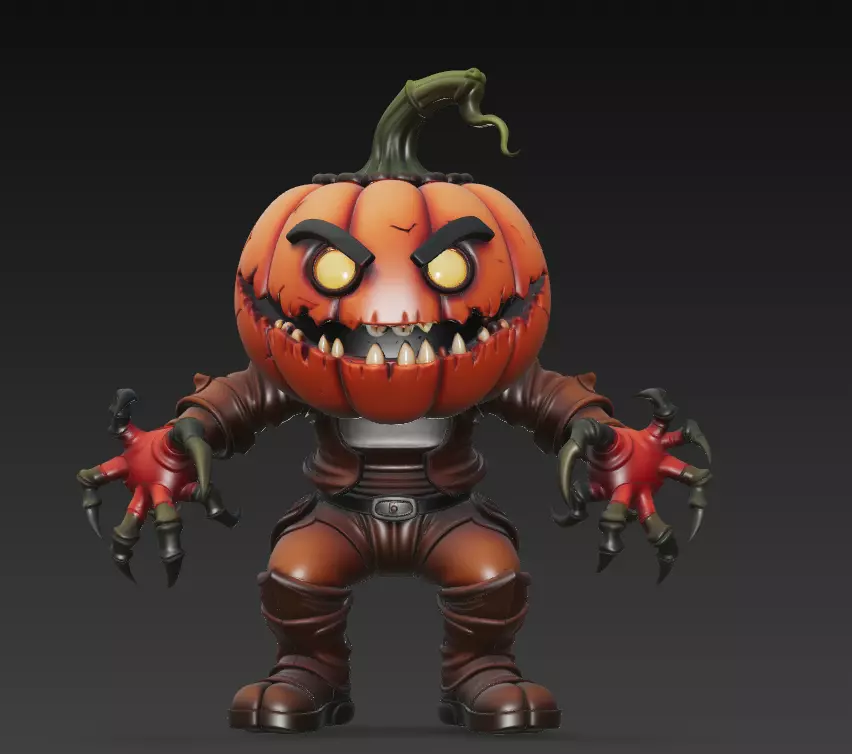 The Pumpkin Raider 3D Model blends horror and stylization to perfection.With its glowing eyes, menacing teeth, clawed hands, and armor-like body, this creature stands out as a fantasy–horror collectible ideal for Halloween scenes, CGI renders, and 3D printed figures.