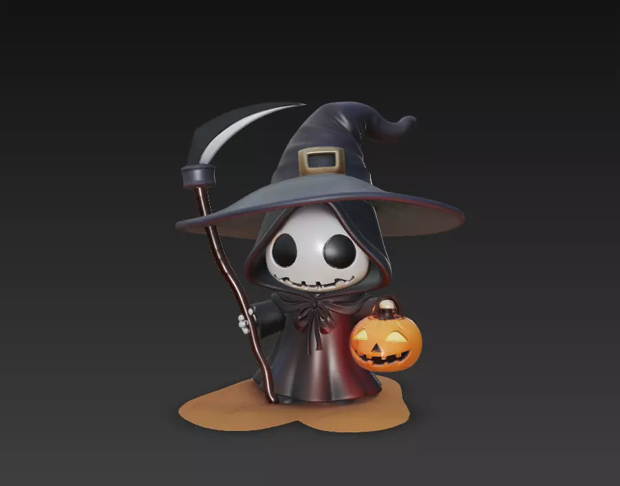 Meet the Pumpkin Reaper, a playful mix of spooky and adorable —a tiny skeleton wrapped in a witch cloak, holding a glowing pumpkin lamp and scythe.This stylized Halloween sculpture captures the balance between charm and darkness,making it a perfect addition for holiday-themed scenes, 3D prints, or collectible art models.