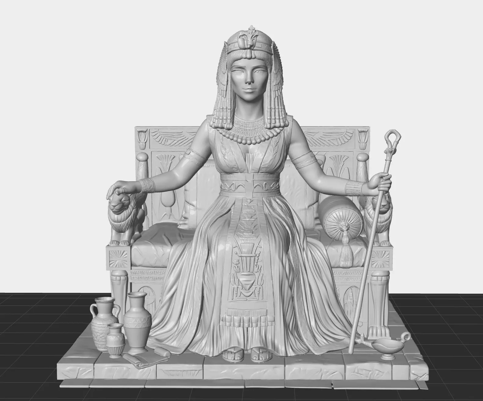 This is a highly detailed, museum-quality STL model of Queen Cleopatra VII, seated regally upon her ornate throne. Designed as a high-fidelity display piece, it is perfect for collectors, historical enthusiasts, and miniature painters.