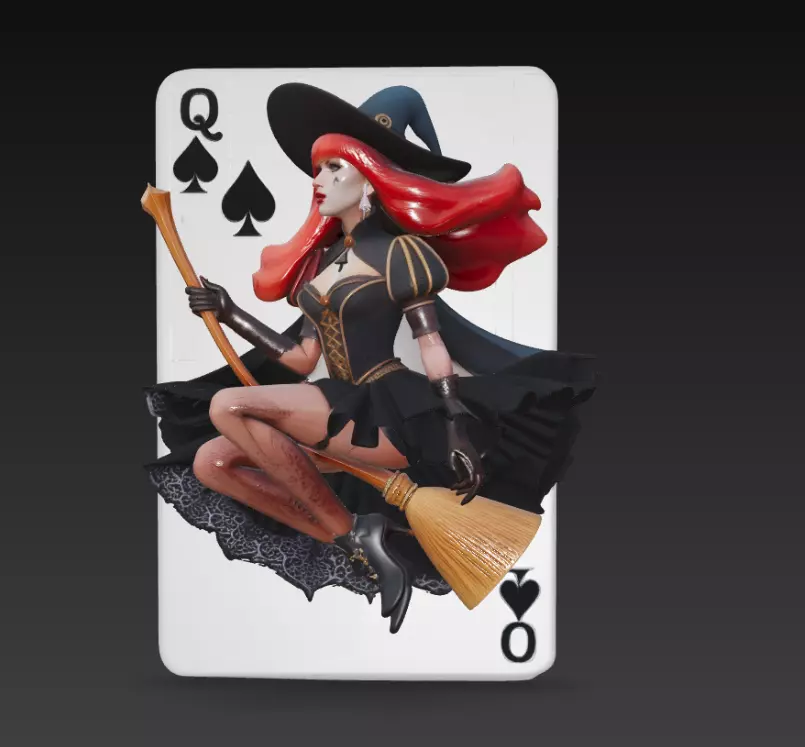 The Queen of Spades Witch 3D Model is a striking fusion of fantasy character design and symbolic playing card aesthetics. Inspired by classic tarot and card deck imagery, this sculpt features a confident witch figure seated elegantly on a broom, framed within the iconic Queen of Spades card composition.