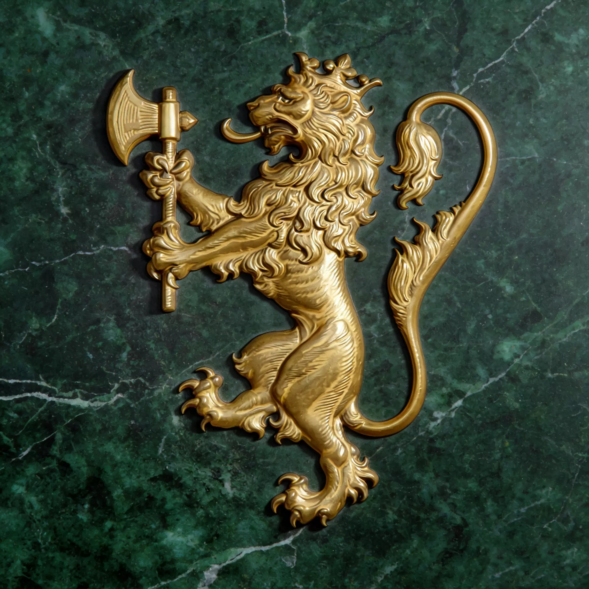 This high-resolution 3D model features a heraldic rampant lion holding a battle axe, inspired by medieval European coat-of-arms designs. The lion stands in the classic heraldic pose symbolizing strength, courage, and nobility.