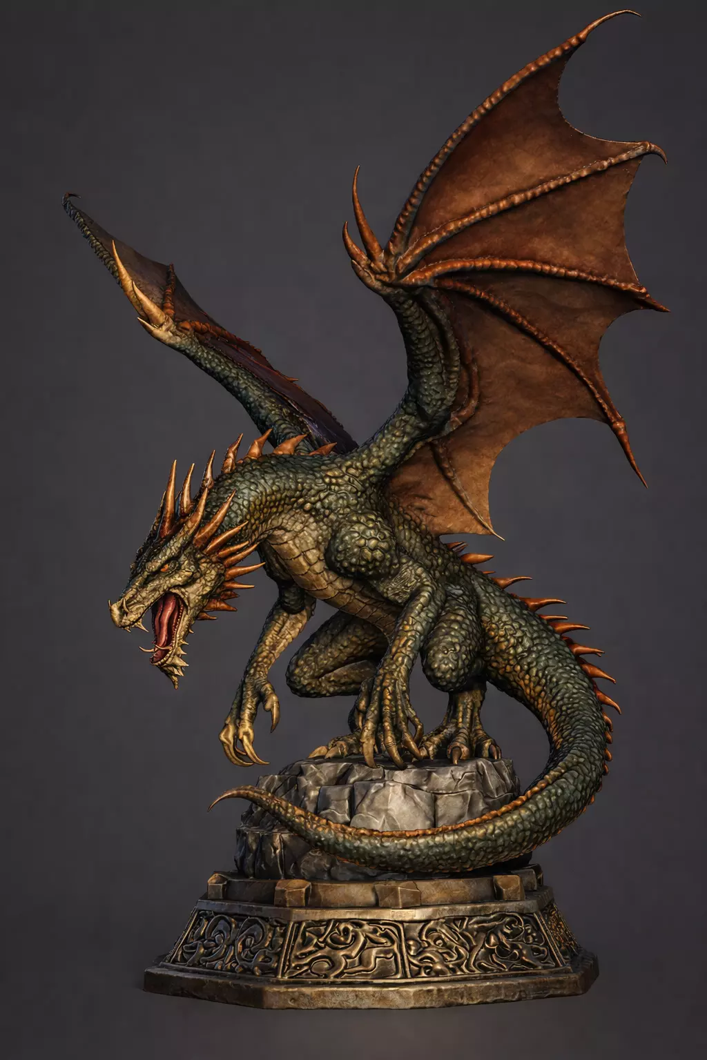 A highly detailed, realistic 3D dragon statue inspired by classic fantasy creatures. The dragon is sculpted in a dynamic, aggressive pose, perched on a carved stone base with ornamental details.
