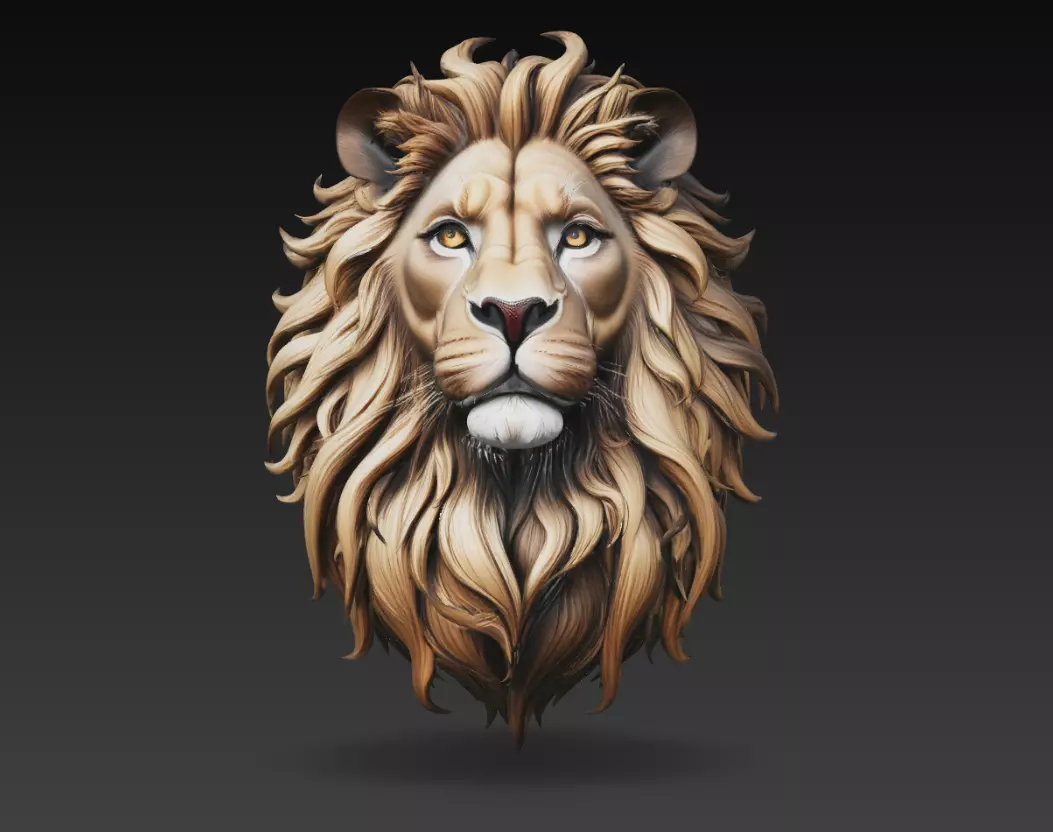 The model captures the noble presence of the lion through carefully sculpted facial proportions, expressive eyes, and a natural muzzle structure. The mane is designed with layered strands of fur that create depth, volume, and movement around the face.