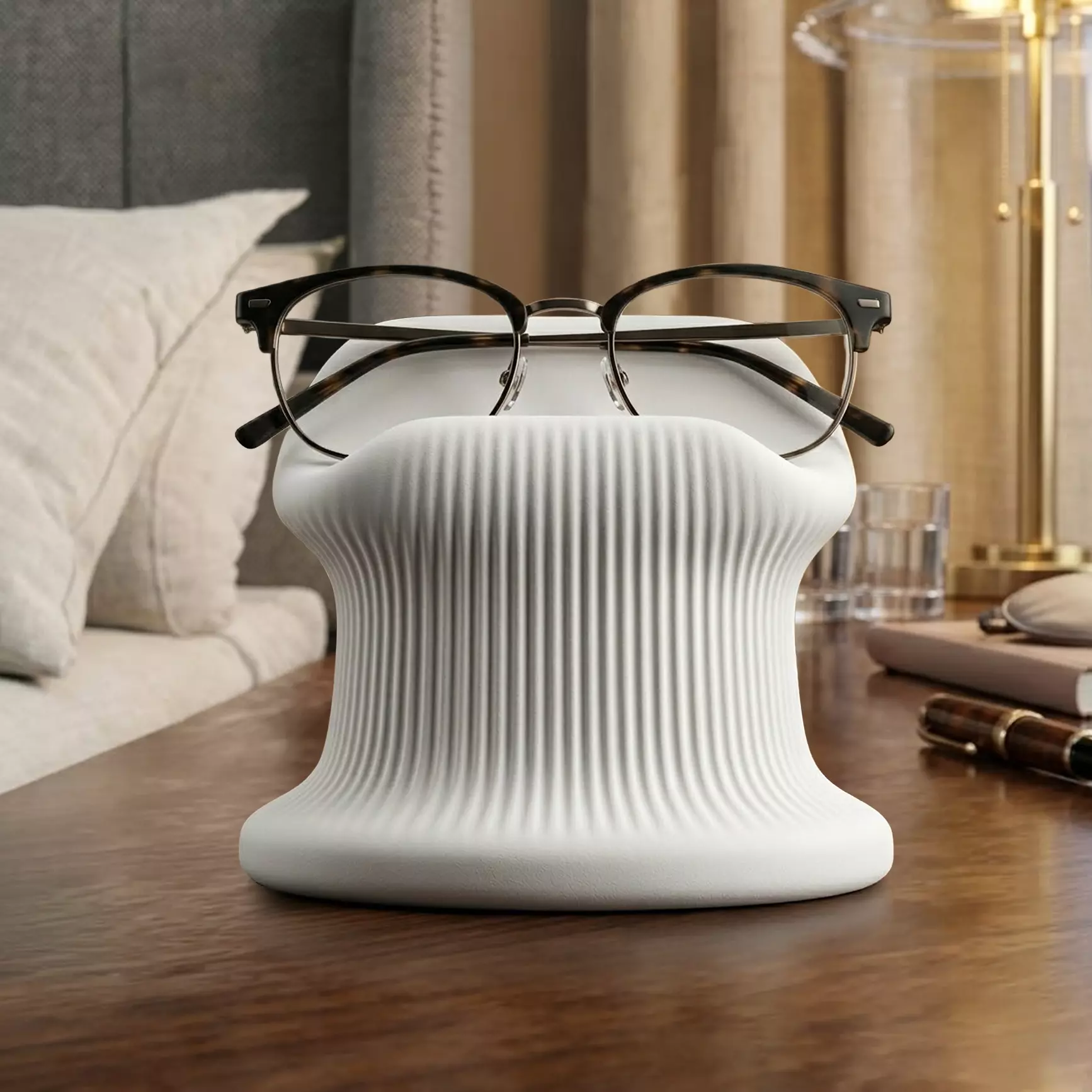 A decorative 3D model of a ribbed pillar holding eyeglasses on a stand. This sculptural piece is suitable for art displays or collectible figurines. The design combines a unique geometric shape with an eye-catching accessory. Perfect for adding a touch of elegance to any room, this standalone ornament can be used as a desk centerpiece or shelf decoration. It can also serve as a creative prop for photography shoots or home decor arrangements. This handcrafted miniature sculpture is made from high-quality materials and features intricate details.