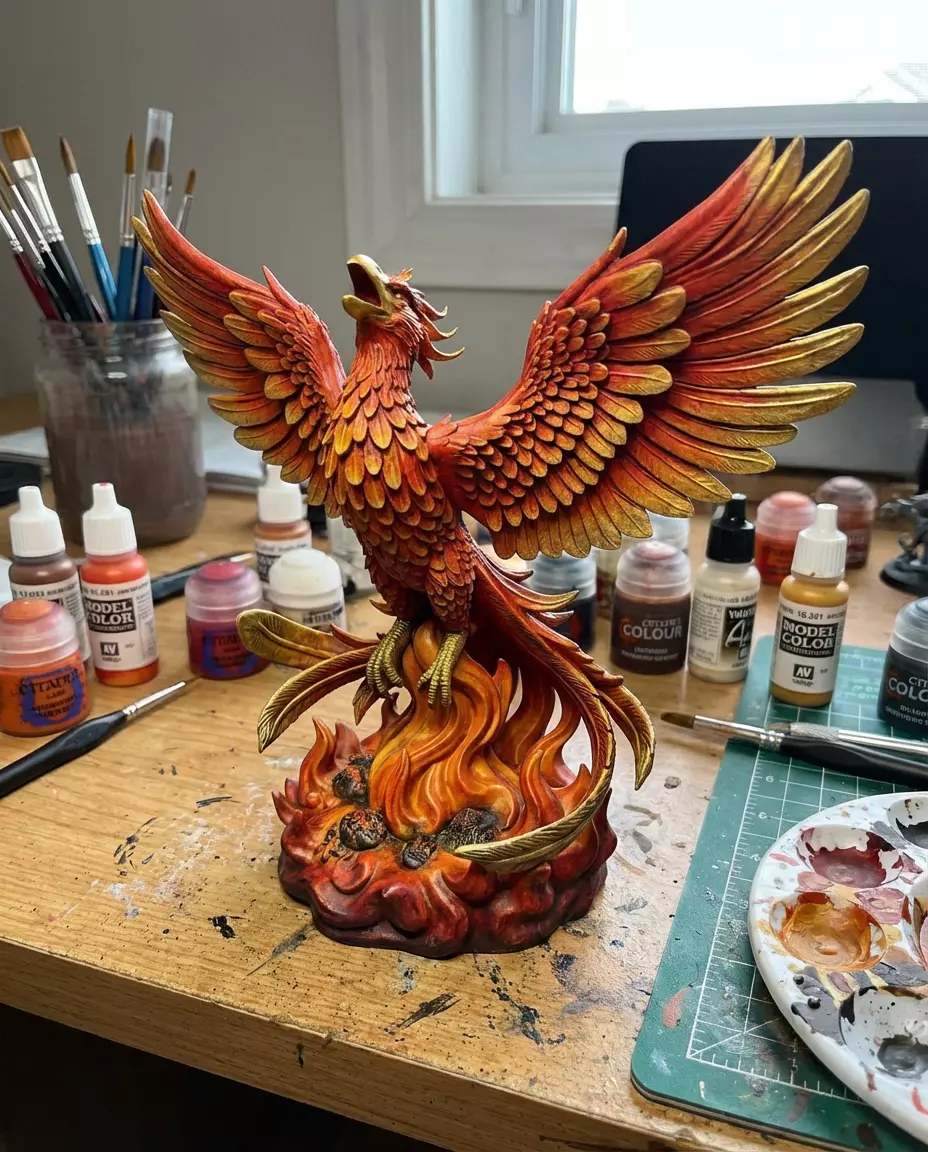 Rising from the ashes. This majestic Phoenix statue captures the mythical fire bird in mid-flight. The individual feathers and flame base are modeled with incredible detail, making it a joy to paint.