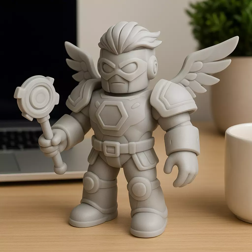 The model features a heroic warrior equipped with ornamental wings, stylized armor, and a ceremonial hammer, giving the figure a strong fantasy character appearance while maintaining simple geometric shapes for reliable printing.