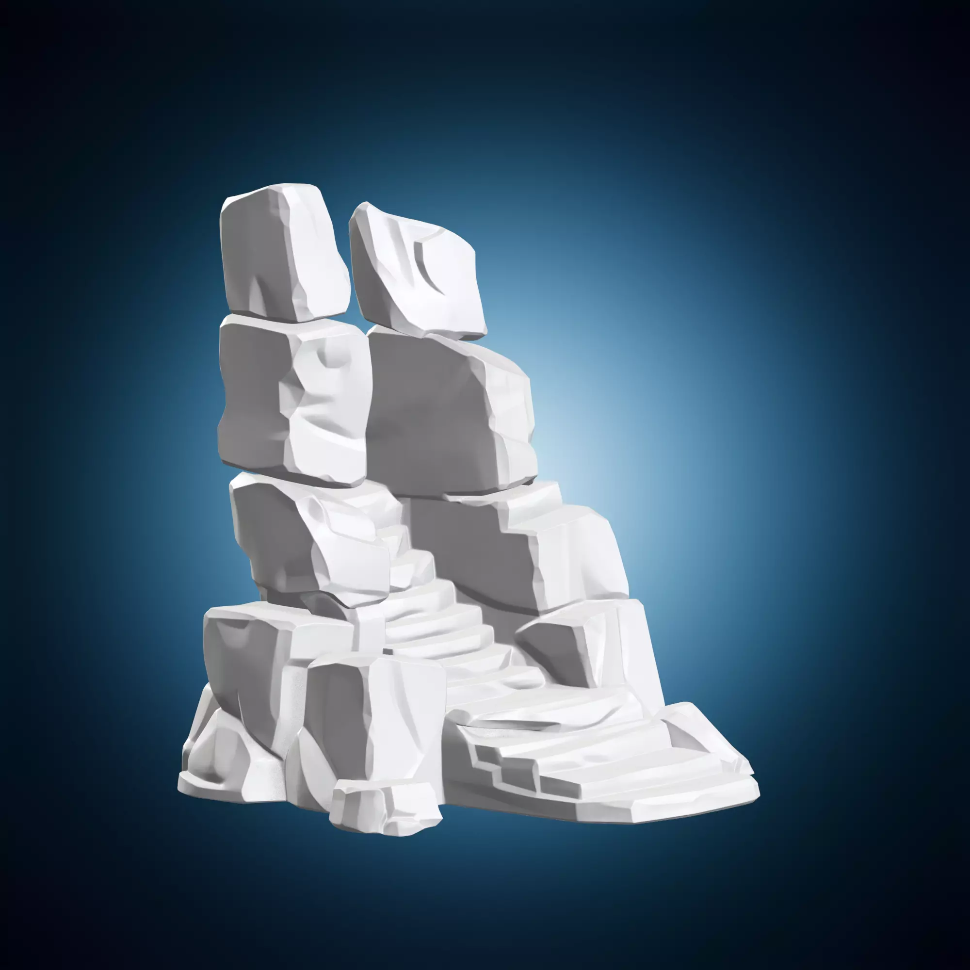 A rugged 3D model featuring rocky stairs leading up a mountain pathway, perfect for wargaming terrain and fantasy settings. The scene is ideal for creating immersive environments in games, movies, or dioramas. The model includes detailed textures and geometry to capture the rough, natural look of the rocks and surrounding landscape. It can be easily scaled and modified to fit various requirements.