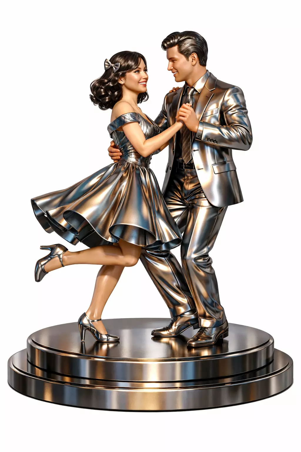 This is an Ai Generated non movable 3d model of a romantic couple dancing gracefully on a decorative podium. The design captures emotion movement and harmony making it ideal for artistic decor wedding themes anniversary gifts and romantic interior visualization.