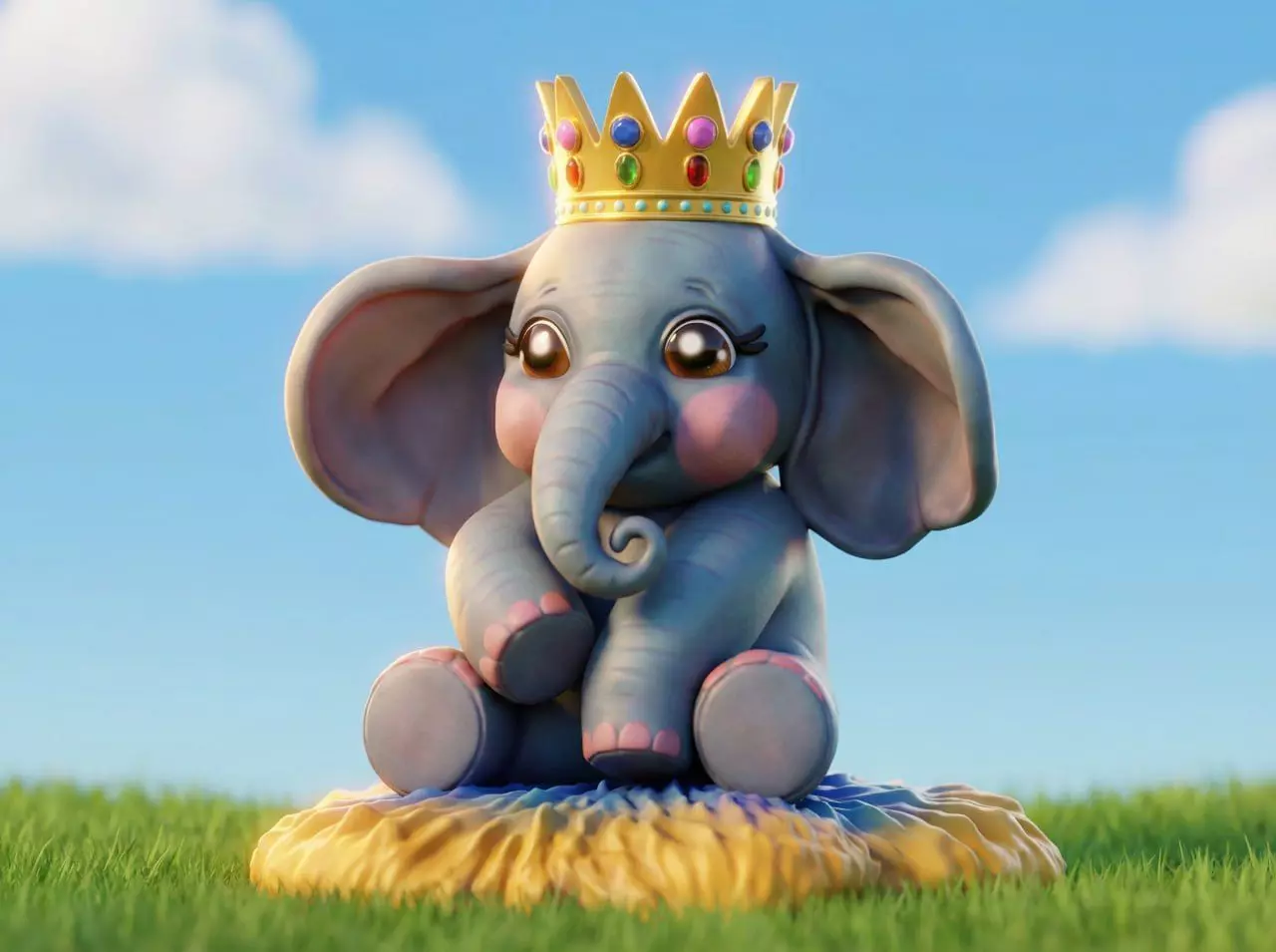 Royal Elephant 3D is a cute, cartoon-style baby elephant wearing a crown. Ideal for 3D printing, decoration, or creative projects, this model combines playful design with regal elements, featuring a crown adorned with colorful gems and a textured cushion base—Suitable for decorative use, cake toppers, collectibles, or playful 3D prints.
