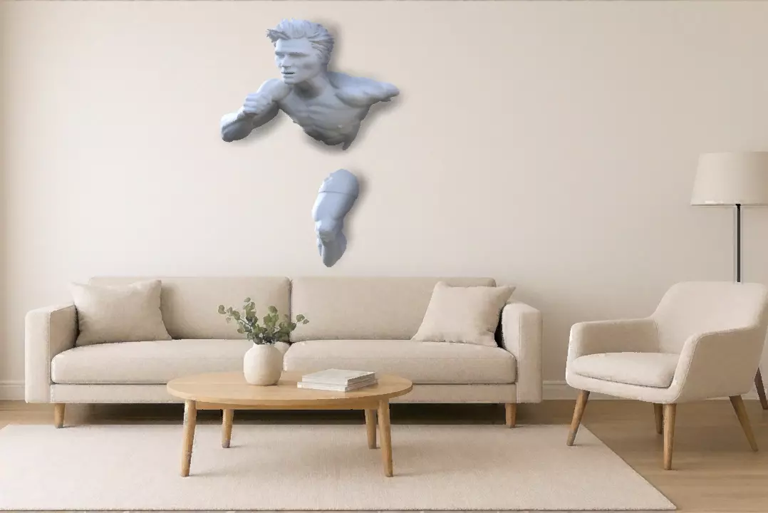 This striking 3D wall sculpture captures the exact moment a male figure bursts forward in full stride, as if breaking through the boundary between two worlds. Designed as a dynamic, high‑impact art piece, the model freezes motion in a way that feels both powerful and effortless — a human form emerging from the wall with cinematic energy.