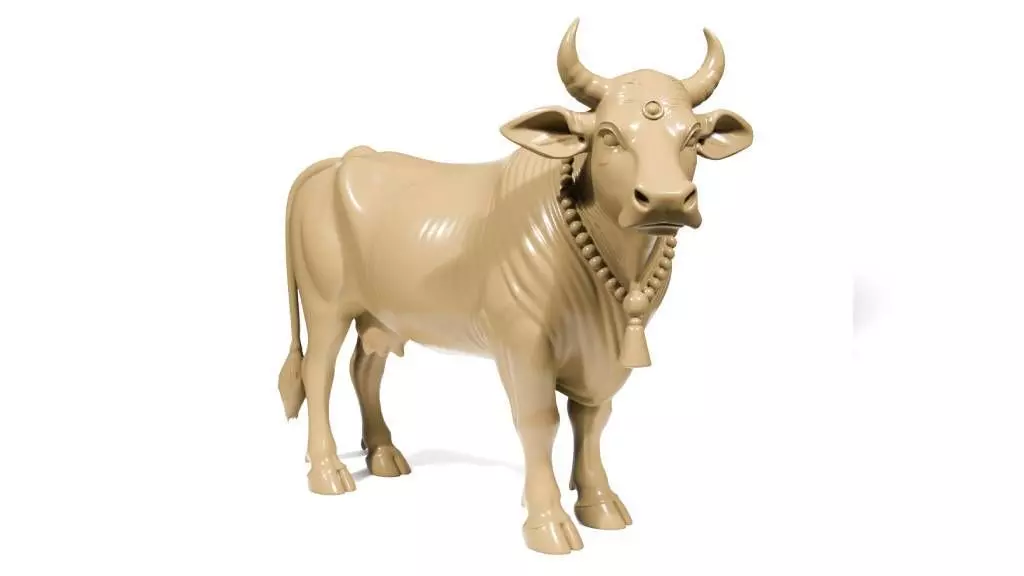 This model of a sacred cow is intricately designed to reflect cultural and religious significance. The attention to detail in the necklace and facial features adds authenticity to the piece.