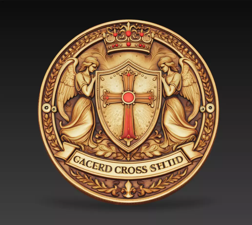 This Sacred Cross Angel Crest 3D Model presents a refined religious emblem captured in a circular high-relief coin composition.