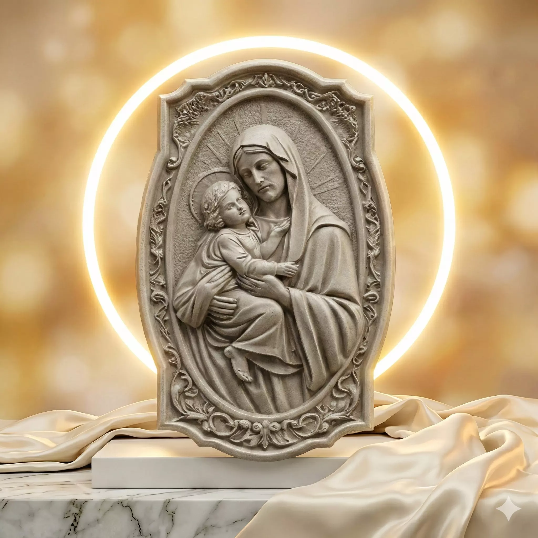 Sacred mother and child scene sculpted in high reliefEmphasis on emotional bond care and protectionStylized symbolic human figures suitable for commercial useDeep layered relief for strong light and shadow contrastOrnamental frame enhancing balance and durabilityIntegrated loop for chain or cord attachment