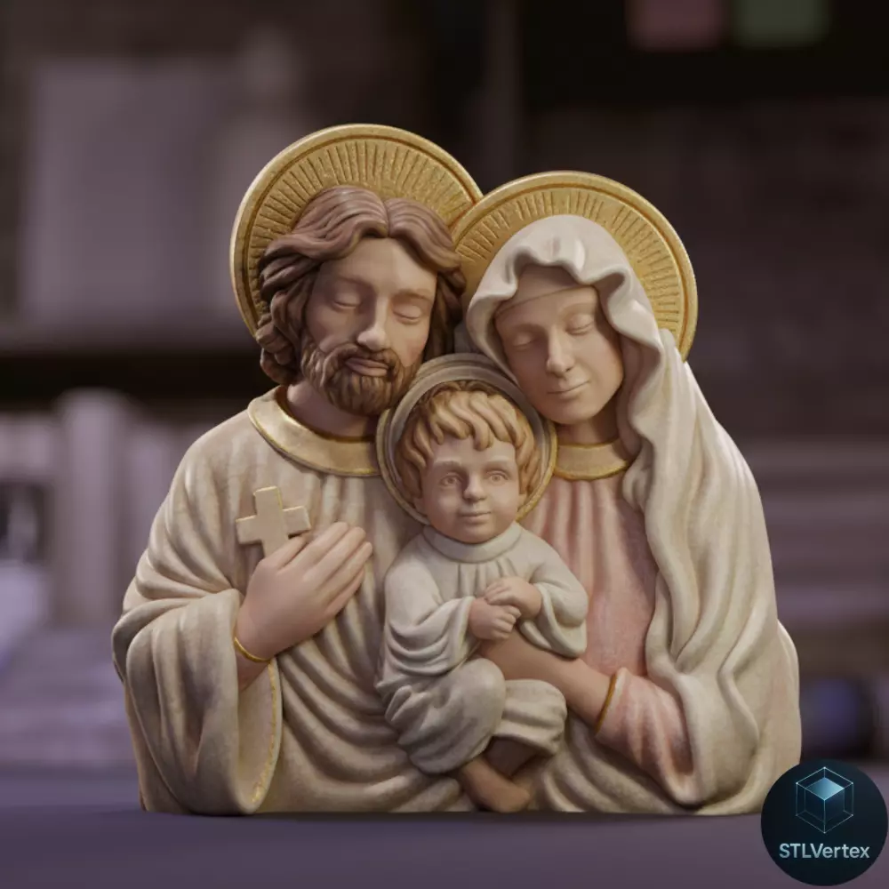 Impresionante modelo 3D escultórico que representa a la Sagrada Familia (Jesús, María y José) en una composición frontal y emotiva, diseñada como un busto o una pieza de altar. El estilo artístico emula el de la estatuaria clásica o barroca, caracterizado por el tratamiento detallado de los paños, que caen en pliegues profundos, y la expresión serena y piadosa de los rostros. Cada figura lleva un halo o nimbo detallado sobre la cabeza, acentuando su carácter sacro. José sostiene una cruz en su mano derecha y María abraza y sostiene al Niño Jesús, quien es el punto focal central. La alta resolución de los detalles faciales y la textura del cabello y la barba de San José lo convierten en un modelo excepcional para impresiones que requieran máxima fidelidad.