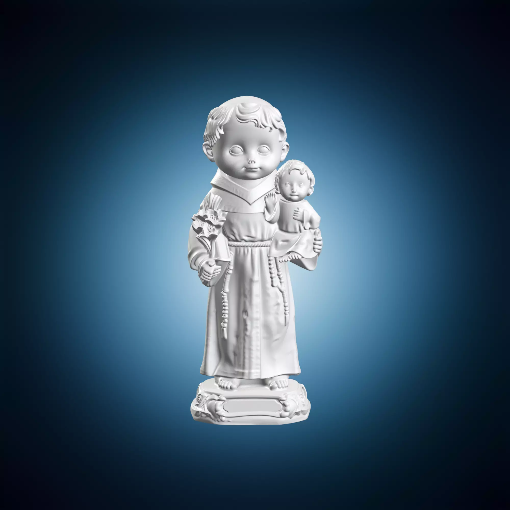 A beautiful 3D model of a medieval statue depicting Saint Anthony holding the child Jesus. The statue is rendered in intricate detail and features a blend of Renaissance and Gothic architectural styles. It can be used for various purposes such as educational, decorative or artistic projects. The model is designed to be highly detailed and accurate, making it suitable for use in 3D modeling software or as a reference image.