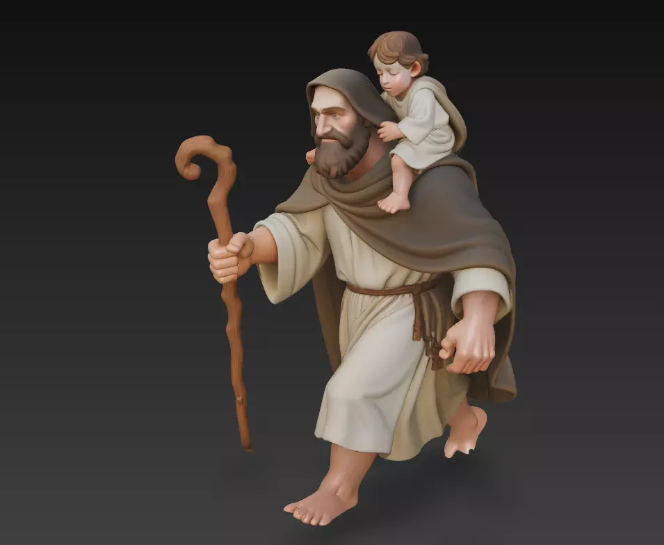 This model depicts Saint Christopher carrying the Holy Child, presented in a soft stylized aesthetic with smooth forms and warm character expression. Designed with careful attention to anatomy, drapery flow, and visual storytelling, it is ideal for 3D printing, collectible figurines, resin casting, decorative art, and religious-themed projects.