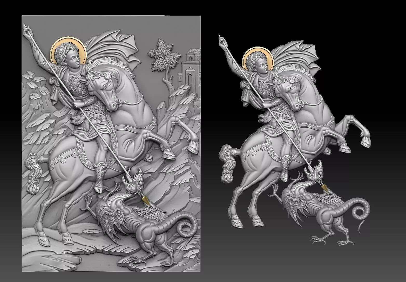 his is a premium, high-polygon 3D model of Saint George on horseback slaying the Dragon, designed in a traditional Orthodox Byzantine style. The relief captures the spiritual essence and classical iconography of the saint, with intricate details on the armor, the horse's movement, and the dragon's ferocity.