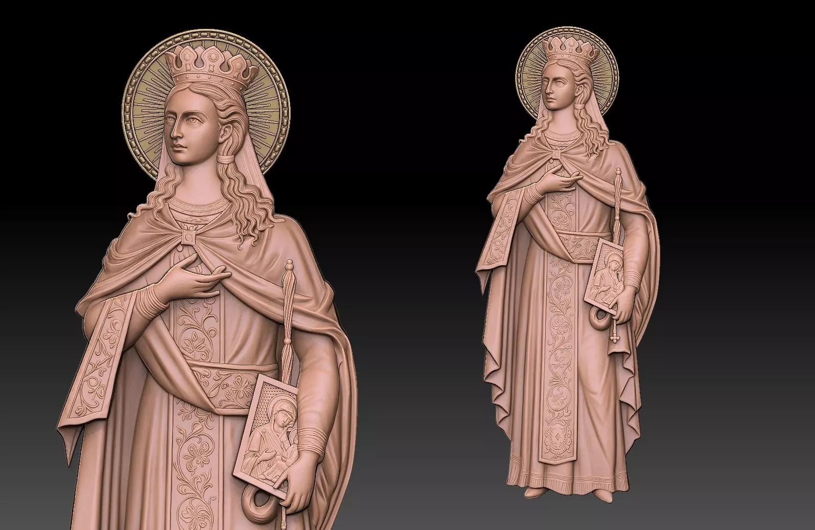 bas-relief STL model of Saint Theodora the Empress (Agia Theodora), revered for her pivotal role in the Restoration of the Holy Icons (Triumph of Orthodoxy).The Saint is depicted in full imperial regalia, wearing a crown and richly embroidered robes adorned with floral patterns. In her left hand, she respectfully holds an icon of the Virgin Mary (Theotokos), symbolizing her defense of the faith, while her right hand rests on her chest in devotion. The model features intricate textures on the vestments and a clean, detailed halo.Technical Specifications:Format: Single Solid STL file (Watertight mesh).Optimization: Designed for CNC wood carving (Routers) and 3D printing (SLA/FDM). The relief has excellent depth (11mm at default scale) ensuring the details of the embroidery stand out clearly in wood or resin.Usage: Ideal for creating wooden icons, church panels, or religious wall art.