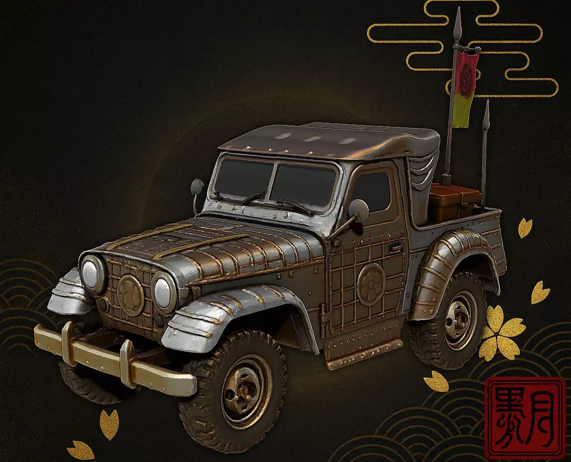 A stylized armored vehicle inspired by classic off-road utility cars, reimagined through the aesthetic lens of samurai armor, Edo-era craftsmanship, and fusion-tech plating.Riveted metal panels, clan-crest motifs, fabric-covered canopy shapes, and ceremonial ornament details give this machine a unique warrior-spirit personality.