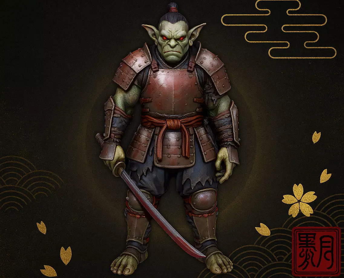 This is a stylized 3D model of a goblin reimagined as a samurai warrior, clad in traditional Japanese-style armor.Unlike the usual mischievous or comical goblins, this version carries a serious and disciplined presence — a true battle-hardened warrior bound by the code of bushido.