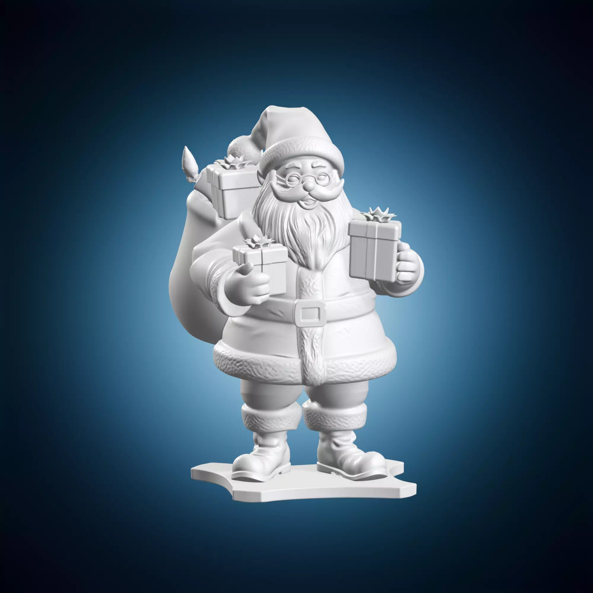 A miniature 3D model of Santa Claus carrying a sack filled with gifts, perfect for holiday decorations or Christmas displays. The model features intricate details and textures, making it suitable for both personal use and commercial applications. Santa's face is smiling and joyful, conveying the spirit of giving and generosity. The sack is adorned with festive ribbons and holly leaves, adding to its visual appeal. This 3D model can be used in various scenes, such as living rooms, offices, or online platforms. It's an excellent way to add a touch of Christmas magic to your digital content.
