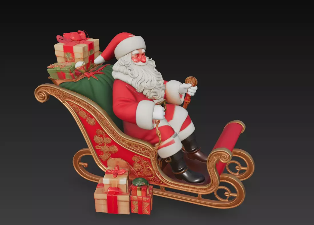 This Santa Claus in Ornate Sleigh 3D Model is a premium holiday sculpture designed with a strong focus on elegance, warmth, and festive storytelling. Santa is comfortably seated in a richly decorated sleigh, holding the reins, surrounded by beautifully wrapped gift boxes that enhance the sense of abundance and celebration.