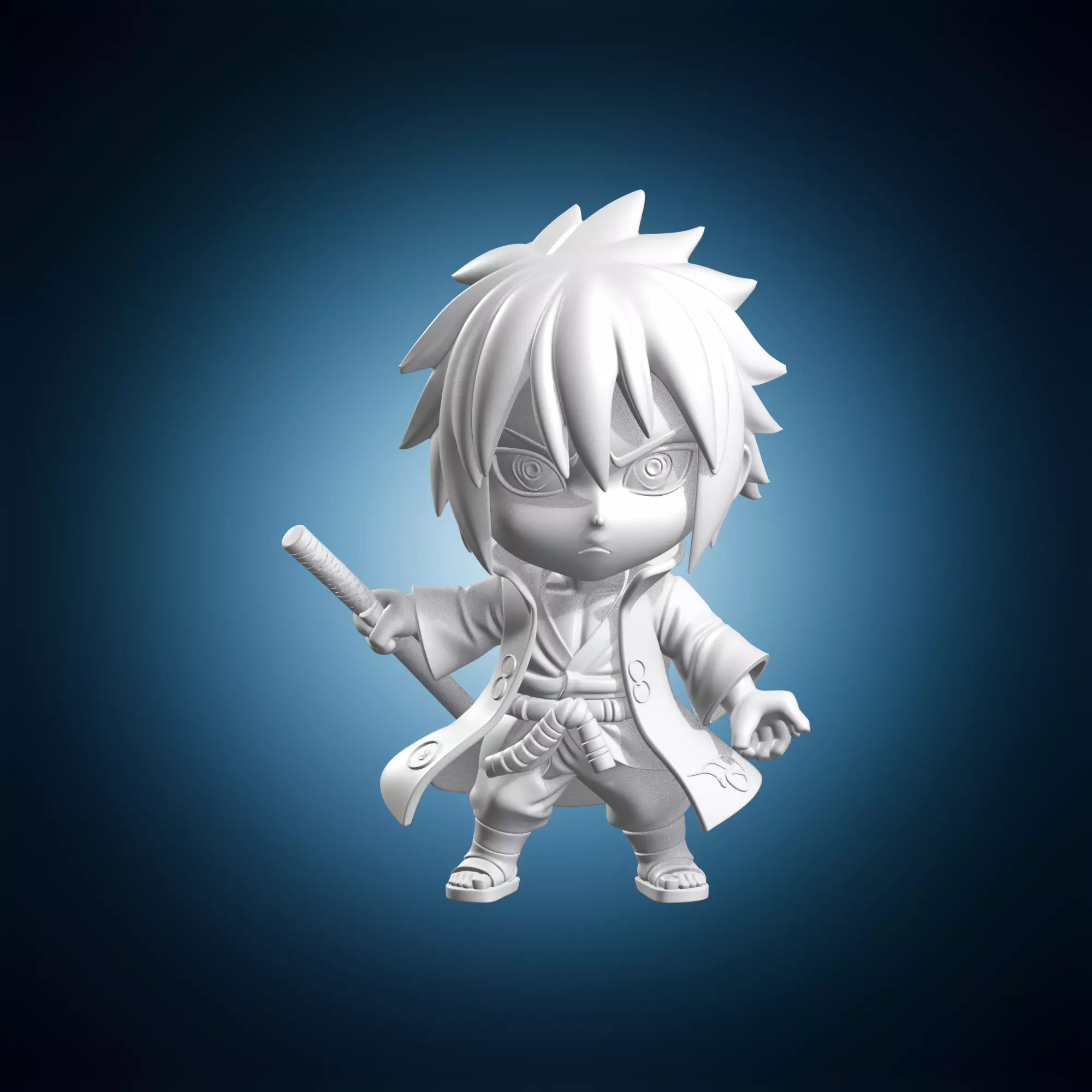 A small figurine of Sasuke Uchiha from Naruto in chibi style ninja costume for display or collecting purposes. The model is designed to be visually appealing and detailed, capturing the character's personality and expression. It can be used as a decoration or a prop for cosplay or fan art projects.