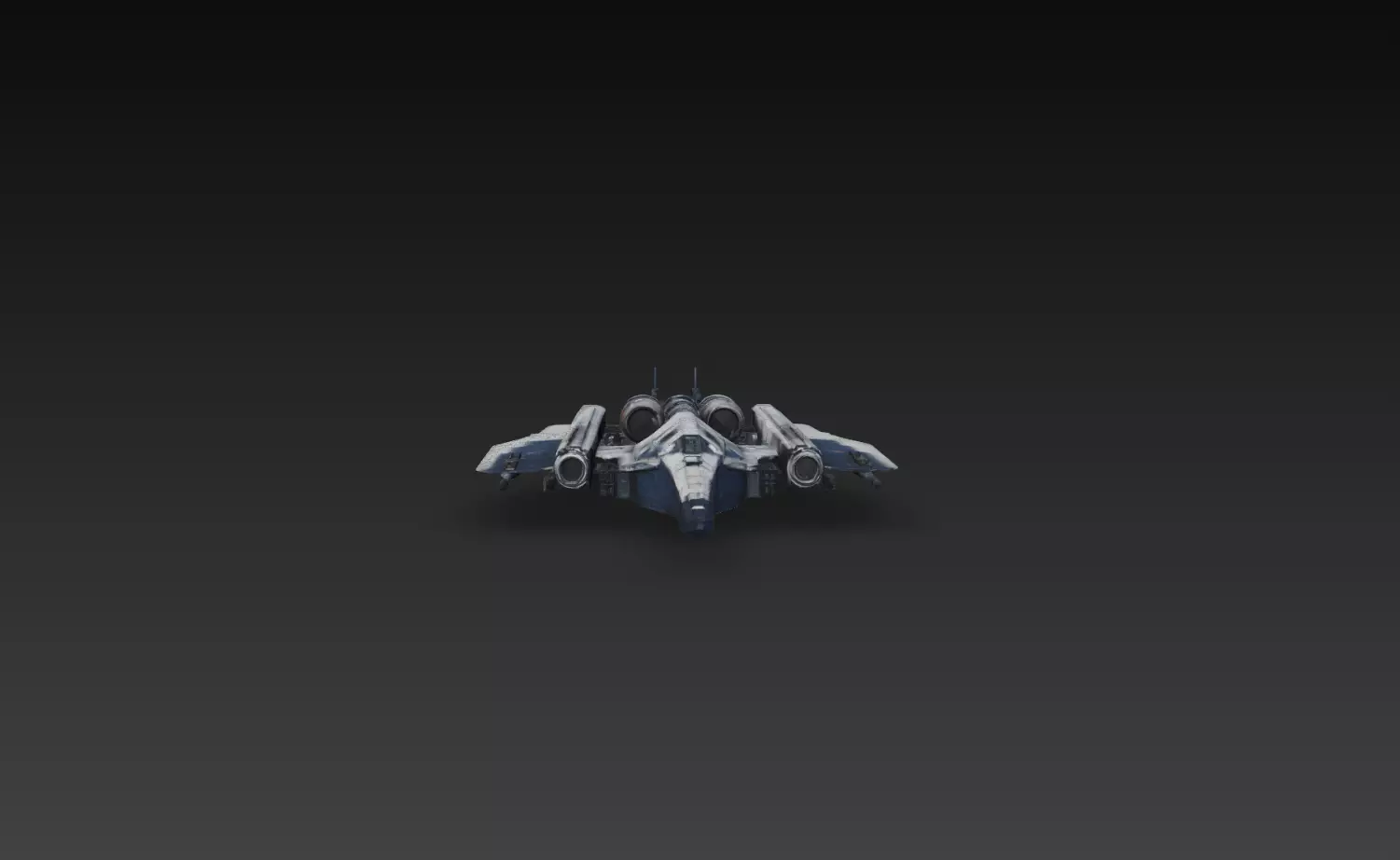 The design emphasizes durability and offensive capability, with large engine housings, strong wing geometry, and visible mechanical components that enhance its military sci-fi identity. The central cockpit, symmetrical structure, and layered surface detailing create a bold and aggressive aesthetic suitable for heavy combat roles.