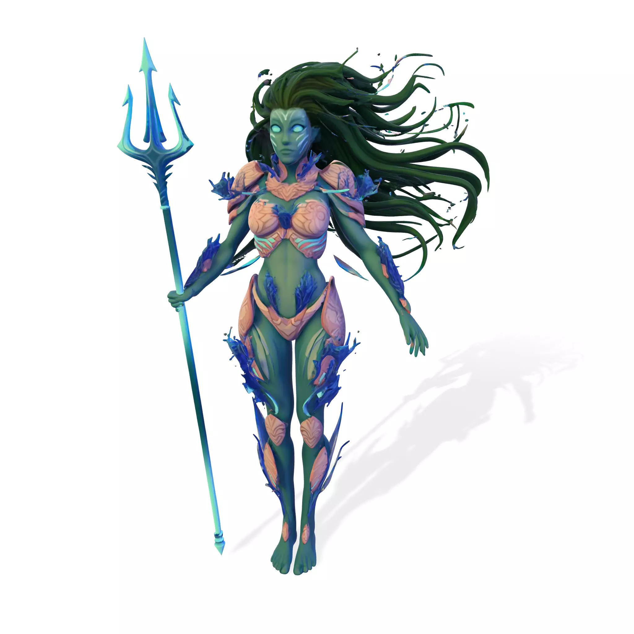 With her flowing, wave-like hair, glowing eyes, and sculpted aquatic armor, she embodies the raw force of the sea. The organic armor plates resemble coral and sea formations, seamlessly integrated into her body, while dynamic water-like effects wrap around her limbs, giving the illusion that she is emerging directly from the ocean itself.Her trident weapon reinforces her role as a ruler of the deep, making this model perfect as a centerpiece statue or powerful fantasy character. Why This Model Sells:Strong female fantasy character (high demand category)Unique water elemental design (rare & eye-catching)Flowing hair and fluid effects - visually dynamicIncludes iconic trident weaponDesigned for premium renders & stunning printed resultsDisplay statues & collector piecesFantasy / mythology loversResin print businesses (great resale potential)Tabletop RPG characters (water mage / sea goddess)Painters looking for a portfolio-level sculpt