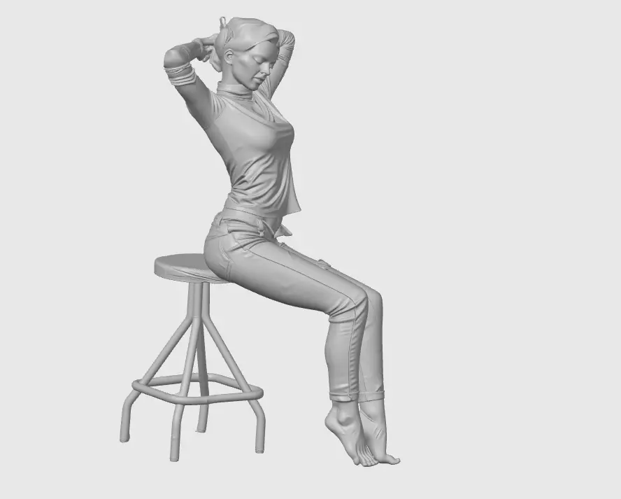 This realistic seated female figure is carefully sculpted for high-quality 3D printing. The model depicts a relaxed pose with natural body proportions, subtle anatomy, and realistic clothing folds. The character is seated on a simple stool, with arms raised behind the head, creating a balanced and expressive silhouette.