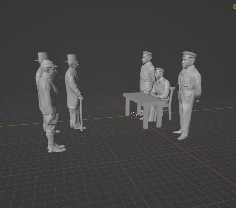 There are 2 different standing soldier and a sitting soldier stick to table(not seperated) at one side.There are also 2 civilians holding cane and file and 2 different soldier standing next to them at the other side.And also a simple table.