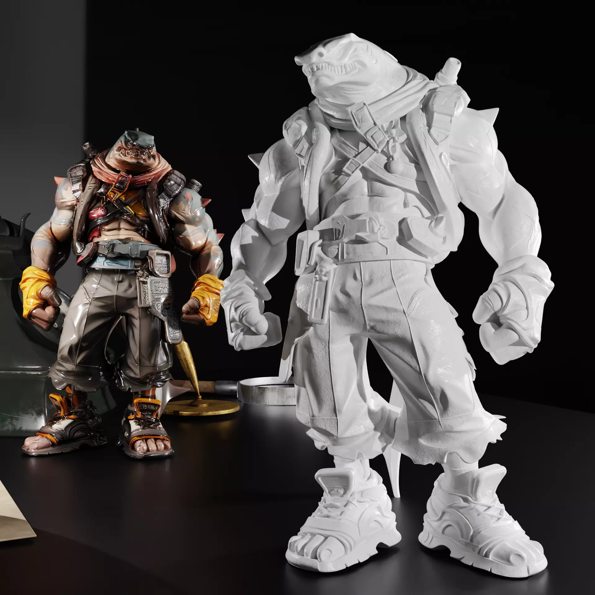 This dynamic anthropomorphic shark warrior combines brutal strength with tactical street-style aesthetics. Featuring a muscular shark humanoid body, layered combat gear, tactical belts, holsters, straps, scarf detail, oversized boots, and textured clothing folds, this model radiates personality and storytelling from every angle.