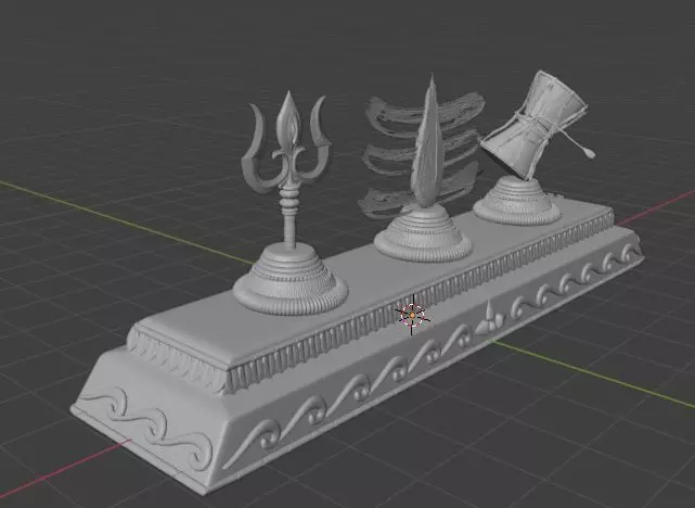 A detailed 3D model showcasing three sacred symbols of Lord Shiva: the Damru (cosmic drum), Tripundra (three sacred ash lines), and Trishul (trident). Each element is carefully designed and placed on an ornate decorative base, making it an ideal piece for spiritual decor, temple displays, festival decorations, or devotional gifts.
