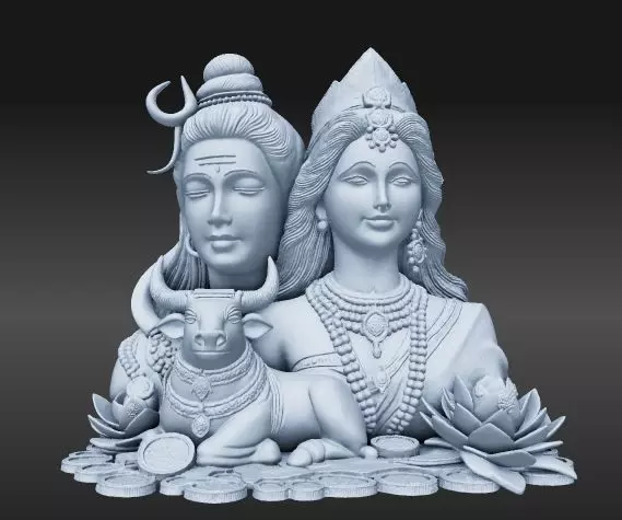 The graceful posture of Shiva and Parvati radiates peace and harmony, while Nandi sits loyally at their feet. The base, adorned with lotus flowers and coins, adds a symbolic touch of prosperity and purity. Whether you're printing in resin or FDM, this sculpture is ready to elevate your spiritual space.
