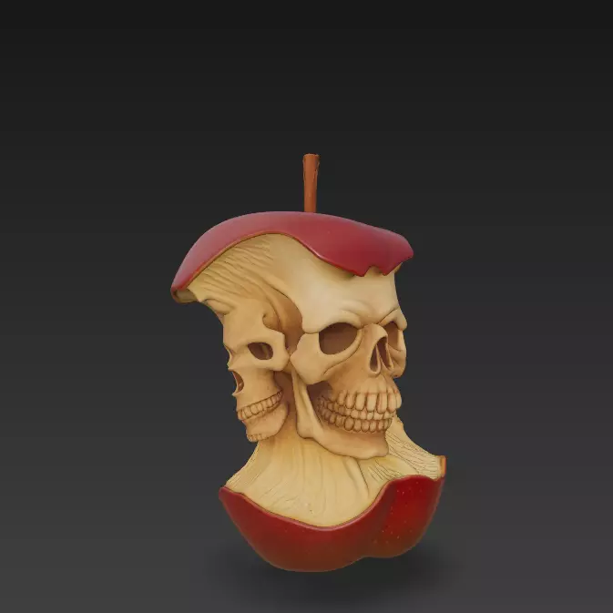 Highly detailed Skull Apple 3D sculpture designed for dark fantasy and horror-inspired art collections. The model combines organic apple shapes with sinister skull details, perfect for CGI renders, collectibles, or unique 3D printed artwork.