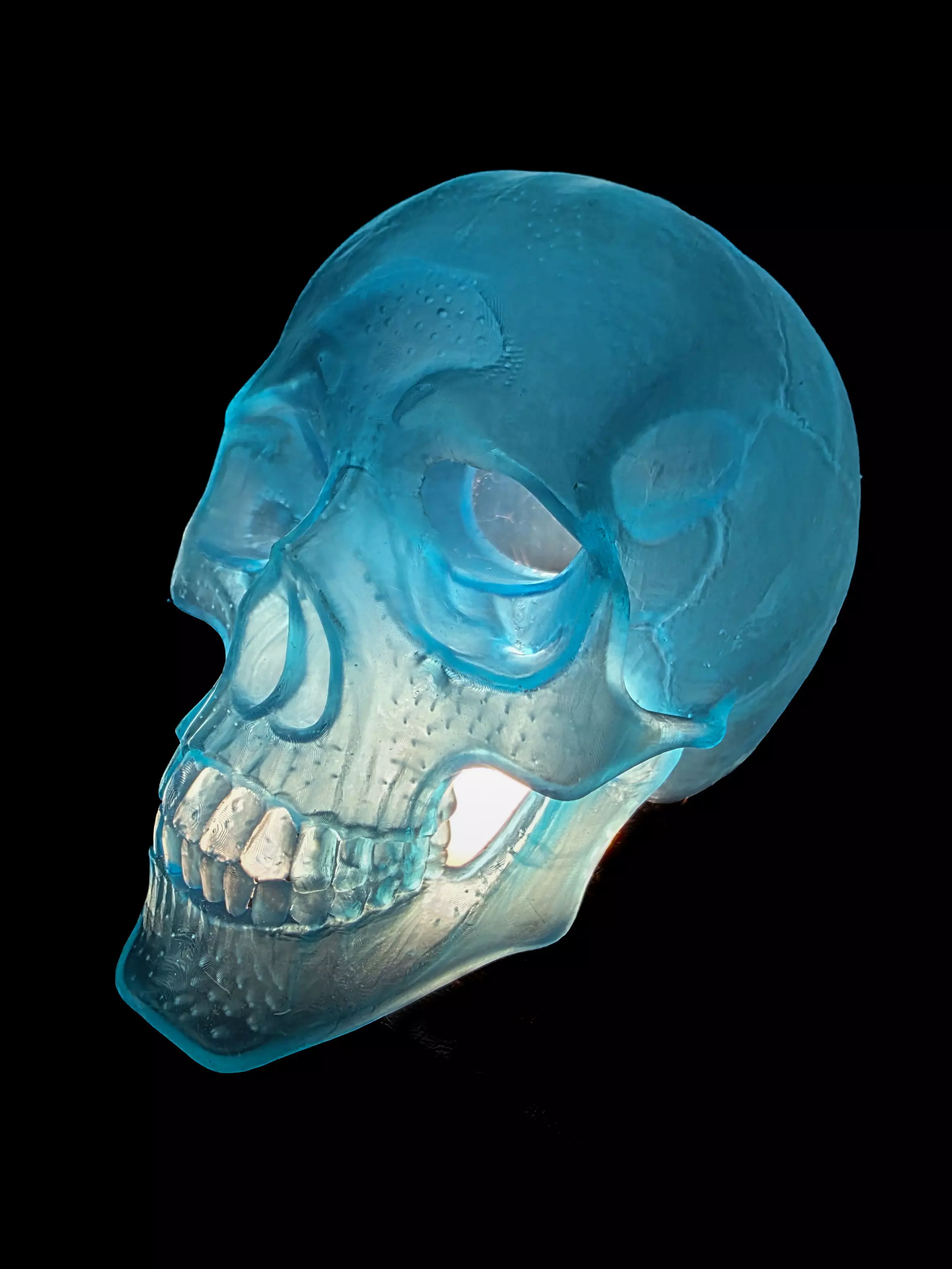 The design is optimized for 3D printing and works especially well with resin printers, allowing the details of the skull to stand out clearly when illuminated.