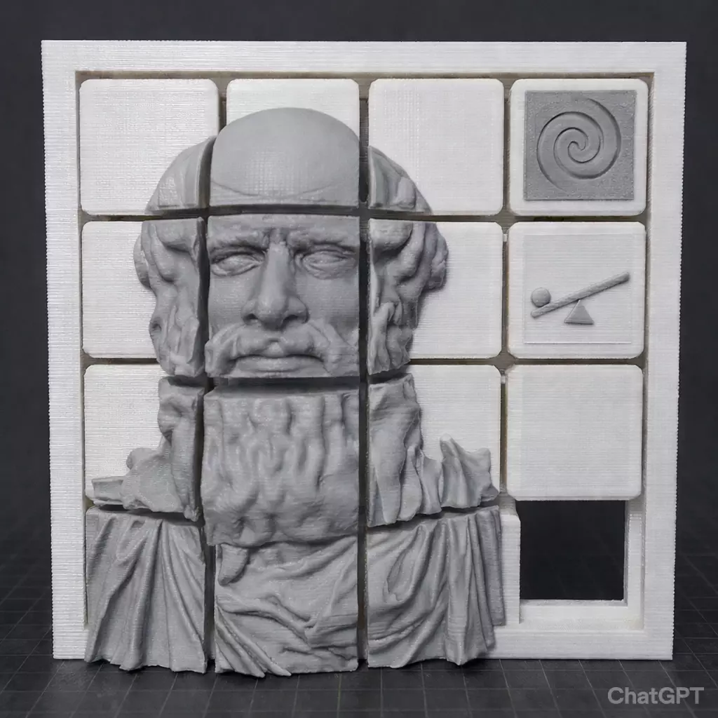 Designed specifically for FDM 3D printing, the puzzle features a detailed relief portrait of Archimedes, accompanied by iconic elements inspired by his works — the spiral and a balance lever. The frame and tiles are engineered for smooth sliding and reliable printability.