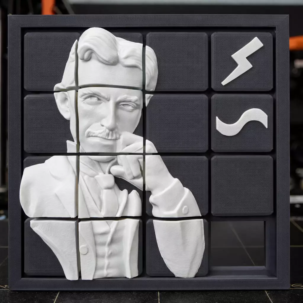 Designed specifically for FDM 3D printing, the puzzle features a detailed relief portrait of Nikola Tesla, accompanied by iconic elements inspired by his works — the lightning and a sinus wave. The frame and tiles are engineered for smooth sliding and reliable printability.