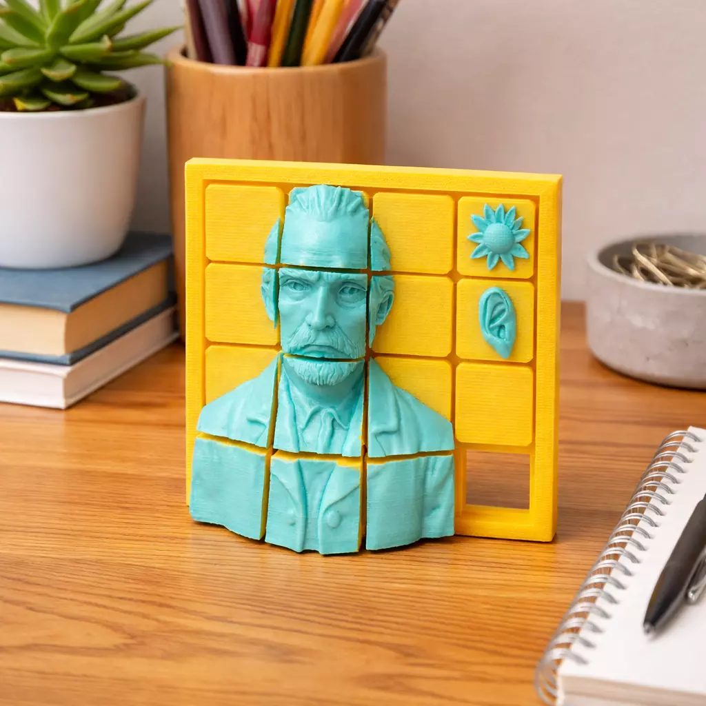 Designed specifically for FDM 3D printing, the puzzle features a detailed relief portrait of Van Gogh, accompanied by iconic elements inspired by his works — the sunflower and ear. The frame and tiles are engineered for smooth sliding and reliable printability.