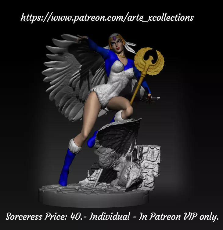 The Sorceress first appears in the He-Man and the Power Sword mini-comic. This version has green skin and wears cobra-themed armor that in later media is occasionally shown as belonging to Teela. In this story, the Sorceress gives He-Man his powers, consistent with later depictions. This mini-comic is the only time Sorceress appears with green skin. This version of the Sorceress was later used as the basis for the character The Goddess in the Masters of the Universe Classics toyline. n the Filmation series, He-Man and the Masters of the Universe, the Sorceress is the mistress and guardian of the Secrets of Castle Grayskull, the source of He-Man's great power.[3]