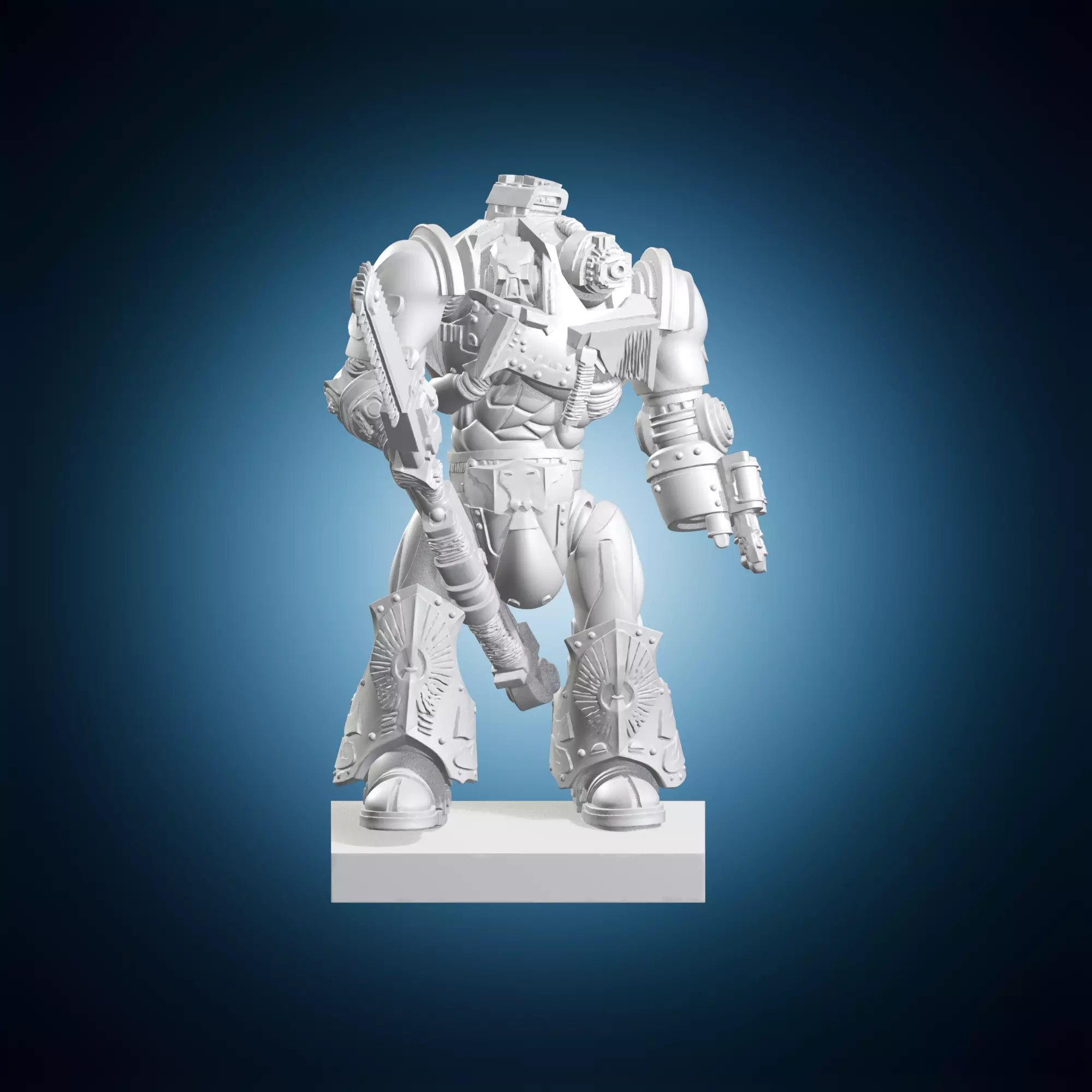 A highly detailed miniature sculpture of a space marine wielding a chainsaw, inspired by the universe. This model is a testament to the skill of sculptors and painters who bring these iconic characters to life. The intricate details and textures on this model make it a must-have for collectors and fans of science fiction. It can be displayed proudly in any room or office as a symbol of strength and resilience. Whether you are a seasoned collector or just starting your journey, this miniature is sure to impress.