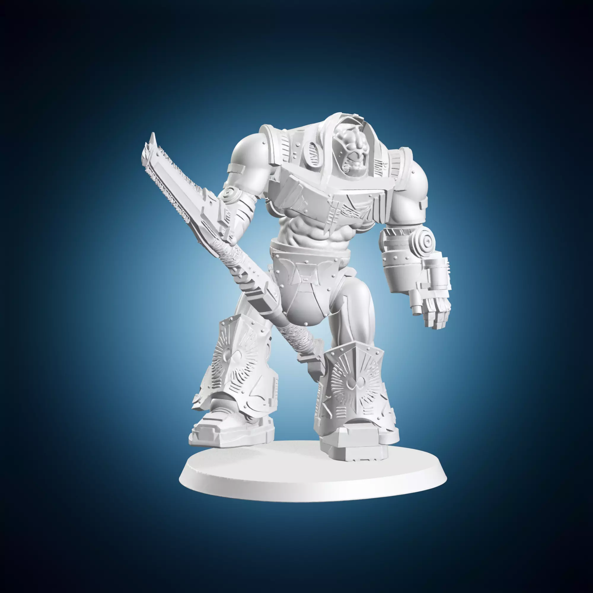 A detailed depiction of a Space Marine wielding a chainsaw and sword in a setting. The model showcases intricate armor details and dynamic pose, highlighting the strength and ferocity of these legendary warriors. Created for use in modeling and wargaming applications, this 3D model is ideal for enthusiasts and hobbyists seeking to enhance their miniature armies. The level of detail and texture ensures a visually stunning representation that accurately captures the essence of universe's iconic Space Marines. Perfectly suited for sculpting and painting techniques, this model also serves as an inspiring reference for artists and designers seeking to create authentic and realistic depictions. The sheer size and complexity of the piece make it a prized addition for any serious collector or enthusiast.