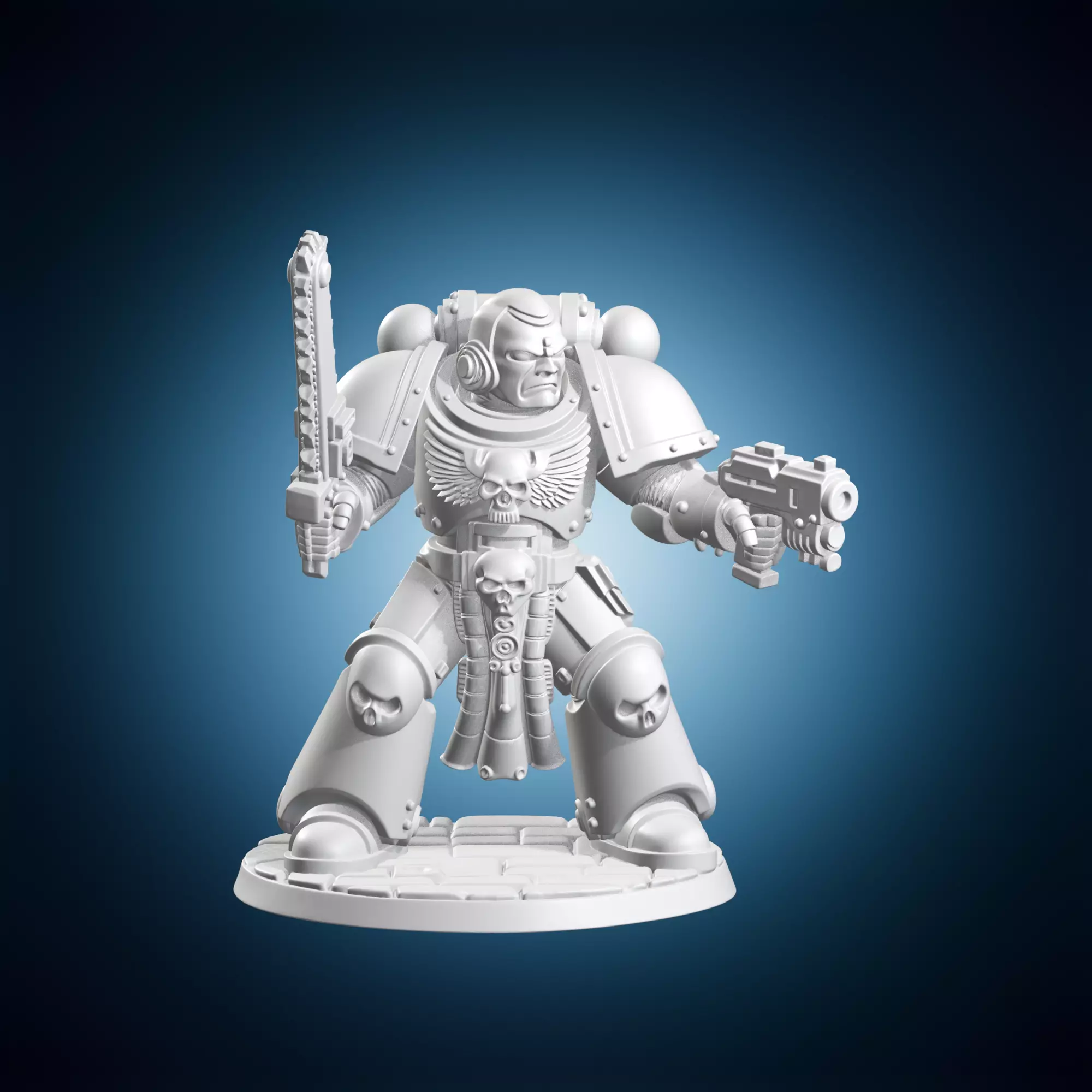 A highly detailed and realistic 3D model of a space marine from the universe wielding a chainsaw pistol. This model is ideal for fans of science fiction and fantasy art. It can be used as a prop, background element, or even as a character model in various applications such as video games or animation. The model features intricate details and textures, making it suitable for high-end 3D printing or rendering. It is also a great addition to any collection of miniature models or sci-fi props.