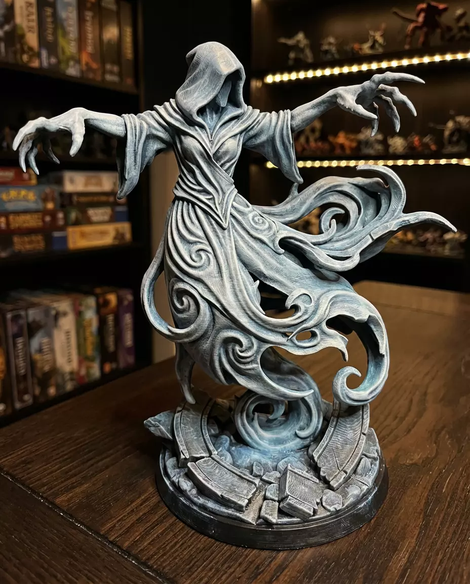 "Channel the ethereal with this haunting Spectral Wraith. Featuring dynamic, flowing robes and magical energy swirls, this statue captures a spirit mid-summoning. An impressive centerpiece for fans of dark fantasy and gothic horror.