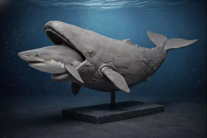 This stunning Sperm Whale vs Shark sculpture captures a rare and dramatic moment from the depths of the ocean — the mighty sperm whale overpowering one of the sea’s most feared predators. The dynamic pose shows the whale in mid-motion, jaws firmly around the shark, creating a powerful sense of movement, strength, and dominance.
