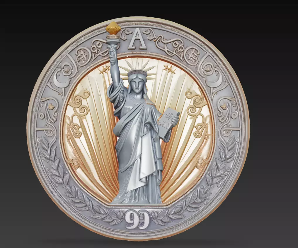 Celebrate freedom and artistry with this Statue of Liberty Relief 3D Model, a beautifully detailed sculpture that captures the timeless symbol of liberty in an ornamental round medallion design.This artwork combines classical relief craftsmanship with modern decorative aesthetics — featuring the Statue of Liberty rising proudly from a radiant golden background, surrounded by intricate engravings and ornamental motifs.