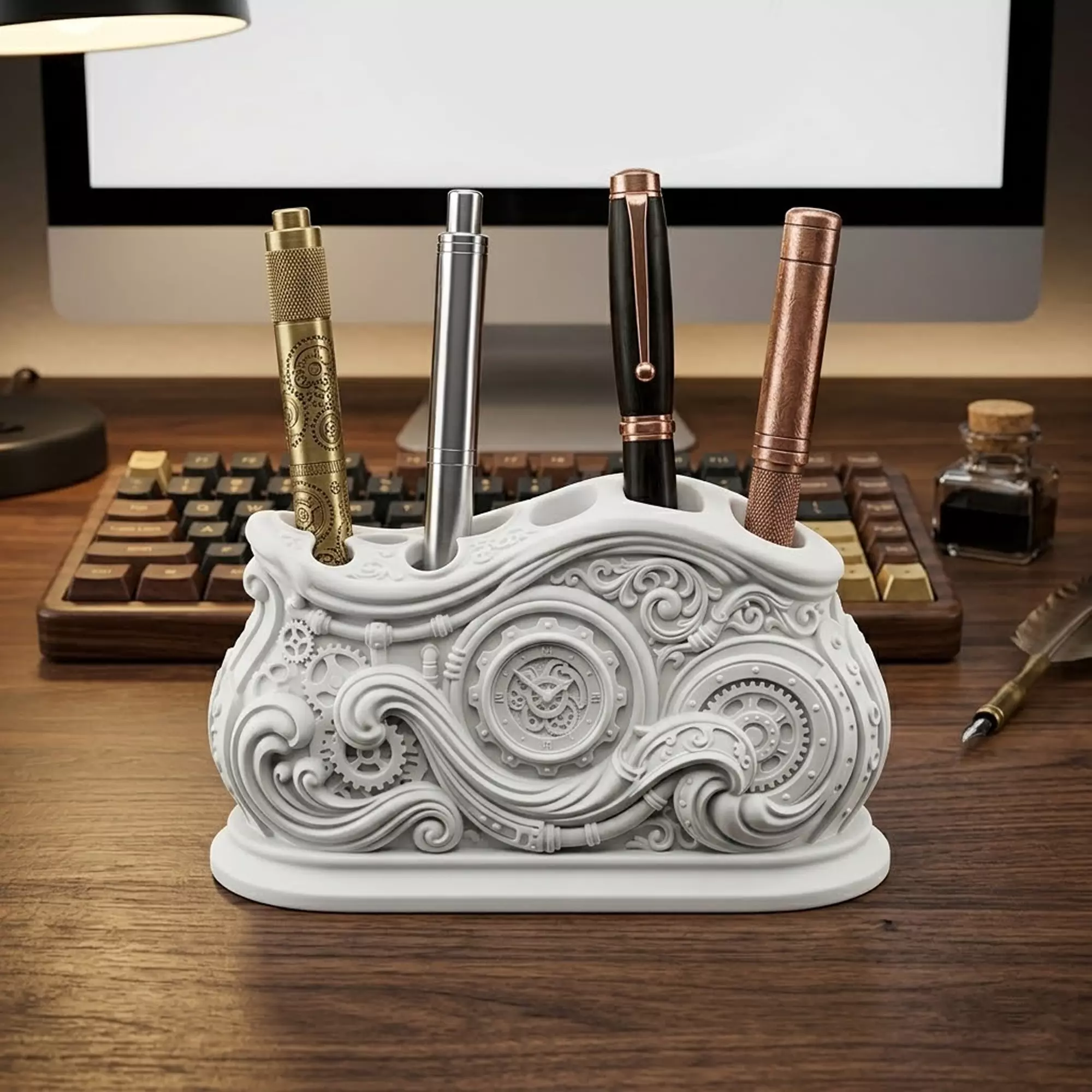A highly detailed and realistic steampunk-inspired desk organizer with intricate gears and mechanisms. This unique piece is perfect for fans of science fiction and fantasy. The design features a mix of industrial and vintage elements, creating a visually striking and functional desk accessory. It can be used to store small office supplies, papers, or other items. The model is designed to fit seamlessly into any steampunk-themed setting, making it an excellent addition to any collection. The level of detail and accuracy makes it a joy to use and admire. Whether you're looking for a decorative piece or a functional desk organizer, this model has got you covered.